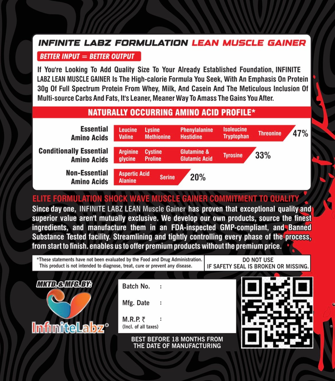Infinite Labz Lean Muscle Gainer is specially formulated for those who want to gain lean muscle mass without unwanted fat. Perfect for hard gainers and athletes looking to bulk up the clean way.
