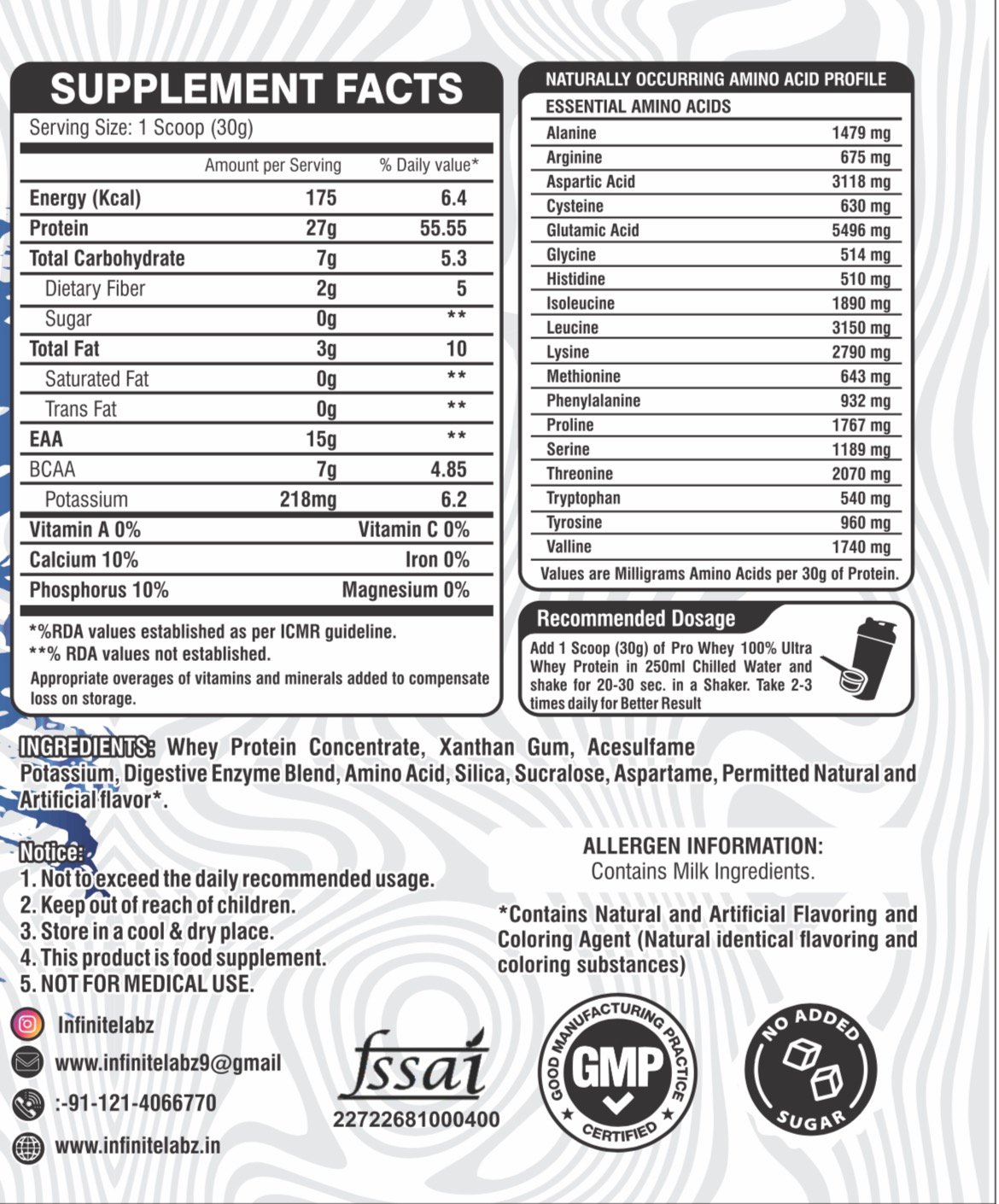 Mix 1 scoop (approx. 30g) of Infinite Labz Isolate Whey Protein with 200–250 ml of water or milk.